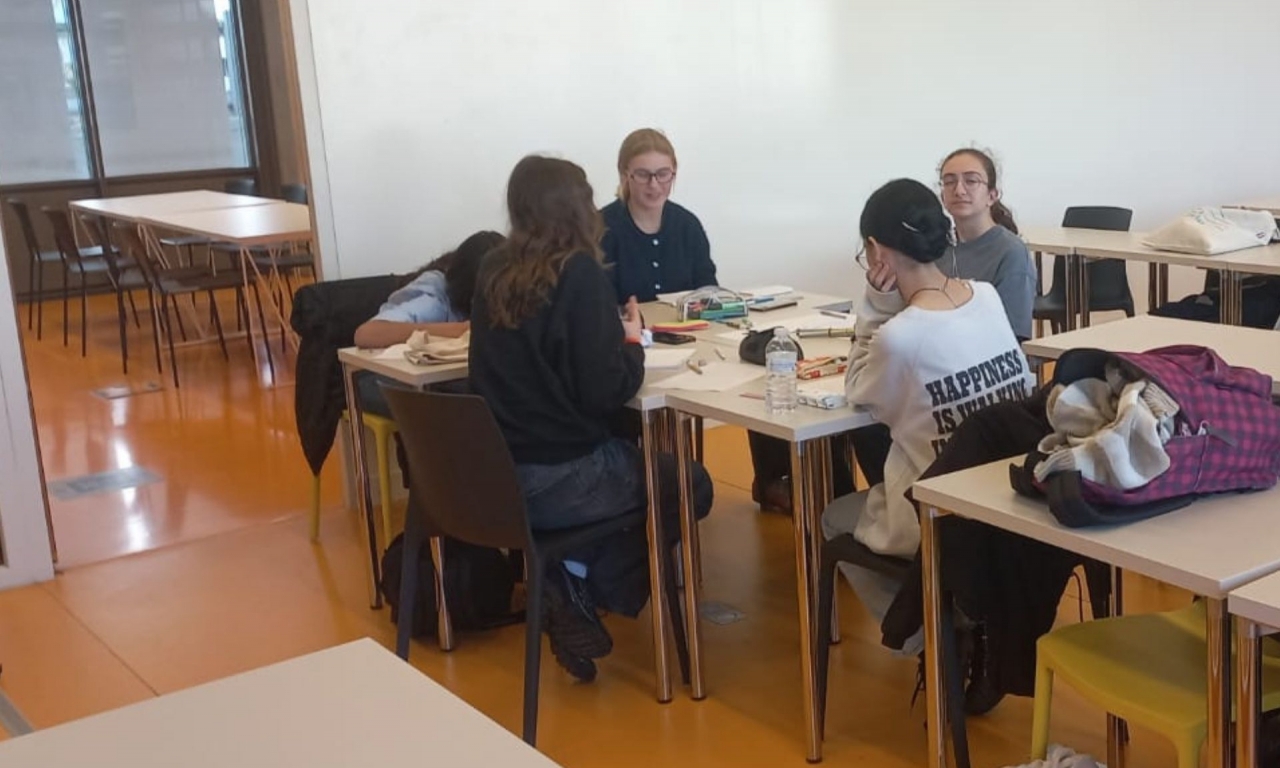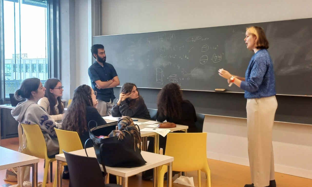 L’après-midi, les lycéennes ont poursuivi leur immersion avec un atelier de recherche encadré par les normaliennes et normaliens de l'ENS Paris-Saclay. Elles ont travaillé sur quatre thématiques fondamentales : relativité restreinte, formation de l’arc-en-ciel, interférences et analyse dimensionnelle.